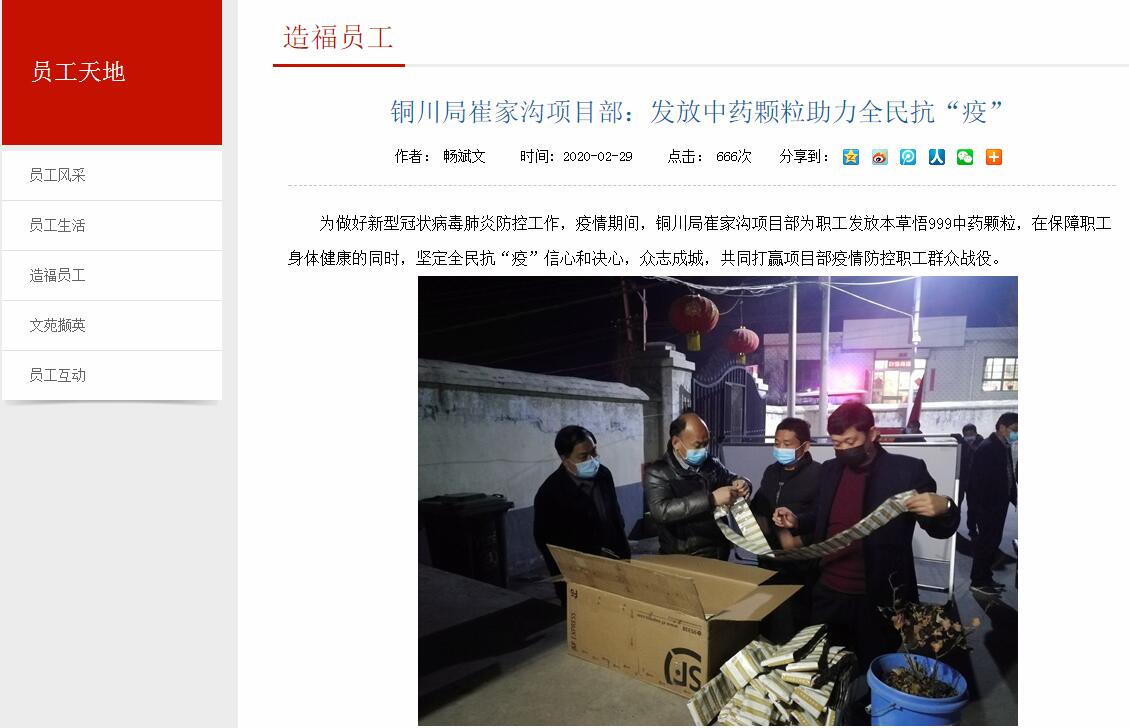 為做好新型冠狀病毒肺炎防控工作,疫情期間,銅川局崔家溝項(xiàng)目部為職工發(fā)放本草悟999中藥顆粒,在保障職工身體健康的同時(shí),堅(jiān)定全民抗“疫”信心和決心,眾志成城,共同打贏項(xiàng)目部疫情防控職工群眾戰(zhàn)役。