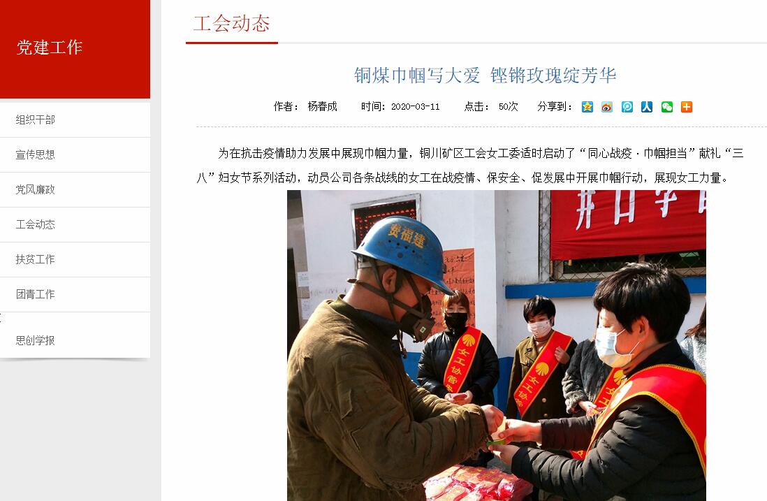 為在抗擊疫情助力發(fā)展中展現(xiàn)巾幗力量,銅川礦區(qū)工會女工委適時啟動了“同心戰(zhàn)疫·巾幗擔(dān)當(dāng)”獻(xiàn)禮“三八”婦女節(jié)系列活動,動員公司各條戰(zhàn)線的女工在戰(zhàn)疫情、保安全、促發(fā)展中開展巾幗行動,展現(xiàn)女工力量。