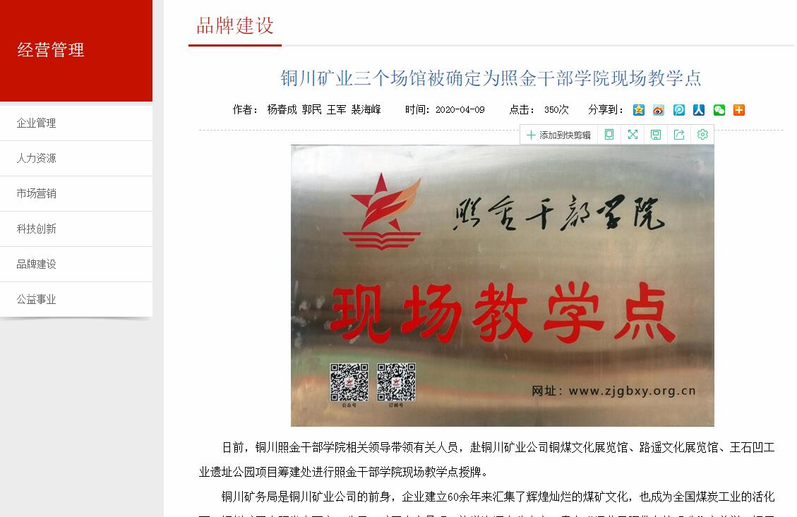 樹(shù)為照金干部學(xué)院教學(xué)點(diǎn)后,銅川礦業(yè)公司將通過(guò)與照金干部學(xué)院加強(qiáng)溝通協(xié)作交流,進(jìn)一步充分發(fā)揮好企業(yè)的歷史文化資源和文化建設(shè)陣地作用,使更多人通過(guò)了解和感悟銅煤歷史、銅煤文化、銅煤精神,積極為建設(shè)和諧文明銅川貢獻(xiàn)力量。照金干部學(xué)院認(rèn)為,銅川礦業(yè)作為老煤企,積淀了深厚的歷史文化,打造出了諸多文化品牌,將銅川礦業(yè)公司3處場(chǎng)館確定為照金干部學(xué)院現(xiàn)場(chǎng)教學(xué)點(diǎn)既有利于雙方共同發(fā)展,也是校企聯(lián)合辦學(xué)方式的創(chuàng)新。