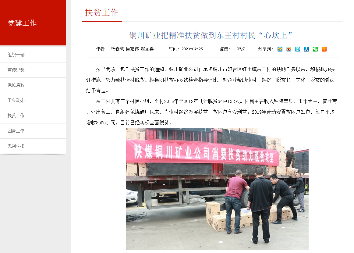 按“兩聯(lián)一包”扶貧工作的通知,銅川礦業(yè)公司自承擔(dān)銅川市印臺區(qū)紅土鎮(zhèn)東王村的扶助任務(wù)以來,積極想辦法訂措施,努力幫扶該村脫貧。經(jīng)集團(tuán)扶貧辦多次檢查指導(dǎo)評比,對企業(yè)幫助該村“經(jīng)濟(jì)”脫貧和“文化”脫貧的做法給予肯定。