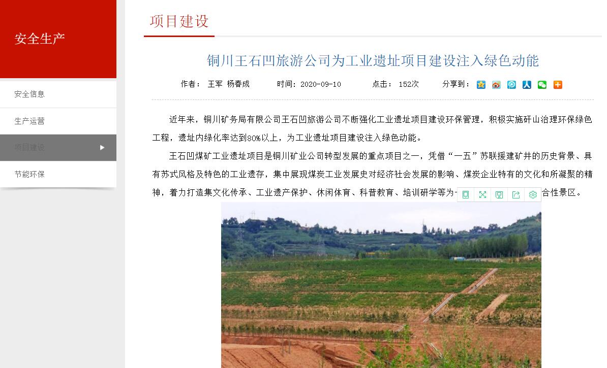 近年來,銅川礦務局有限公司王石凹旅游公司不斷強化工業(yè)遺址項目建設環(huán)保管理,積極實施矸山治理環(huán)保綠色工程,遺址內(nèi)綠化率達到80%以上,為工業(yè)遺址項目建設注入綠色動能。