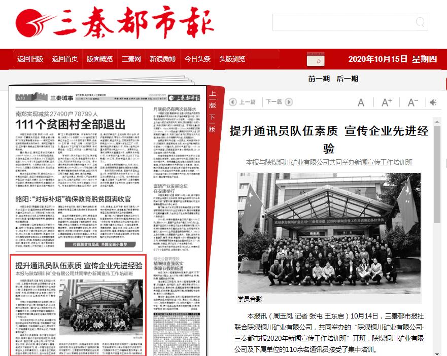 本報訊(周玉鳳 記者 張屯 王東啟)10月14日,三秦都市報社聯(lián)合陜煤銅川礦業(yè)有限公司,共同舉辦的“陜煤銅川礦業(yè)有限公司·三秦都市報2020年新聞宣傳工作培訓班”開班,陜煤銅川礦業(yè)有限公司及下屬單位的110余名通訊員接受了集中培訓。