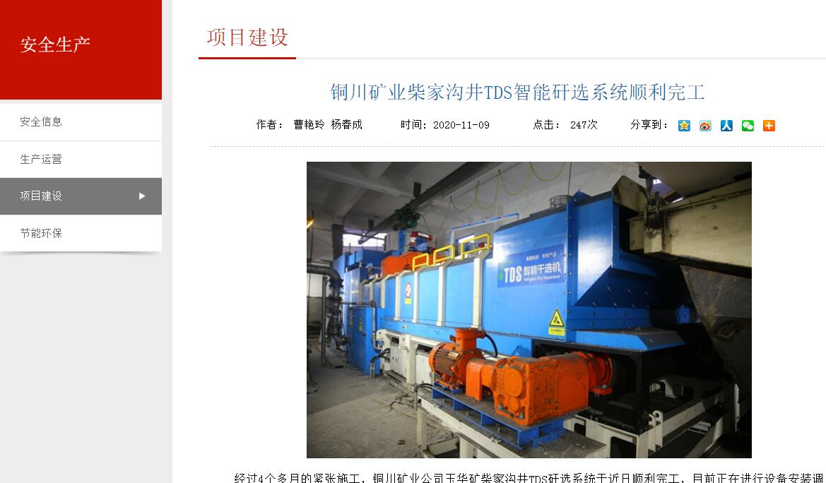 銅川礦業(yè)柴家溝井TDS智能矸選系統(tǒng)順利完工
