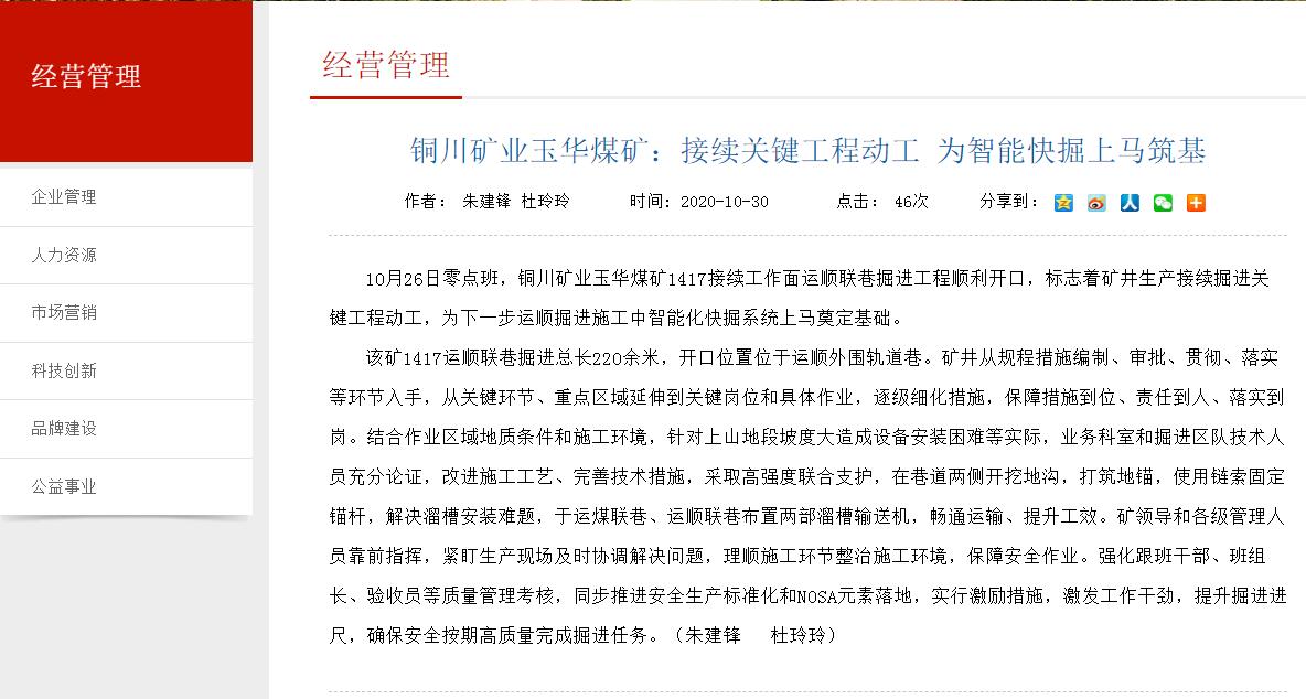 10月26日零點班,銅川礦業(yè)玉華煤礦1417接續(xù)工作面運順聯(lián)巷掘進工程順利開口,標志著礦井生產(chǎn)接續(xù)掘進關(guān)鍵工程動工,為下一步運順掘進施工中智能化快掘系統(tǒng)上馬奠定基礎。