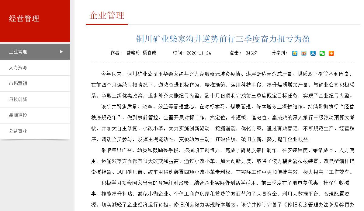 銅川礦業(yè)柴家溝井逆勢(shì)前行三季度奮力扭虧為盈