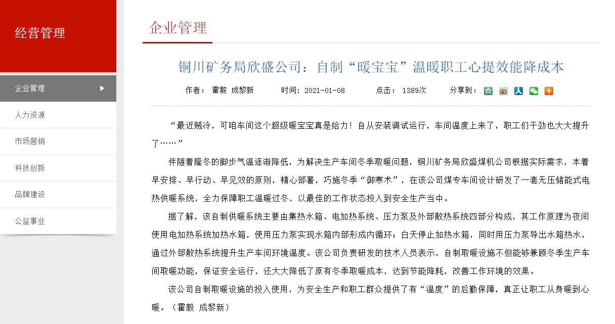 伴隨著隆冬的腳步氣溫逐漸降低,為解決生產(chǎn)車間冬季取暖問題,銅川礦務(wù)局欣盛煤機(jī)公司根據(jù)實(shí)際需求,本著早安排、早行動、早見效的原則,精心部署,巧施冬季“御寒術(shù)”,在該公司煤專車間設(shè)計研發(fā)了一套無壓儲能式電熱供暖系統(tǒng),全力保障職工溫暖過冬,以最佳的工作狀態(tài)投入到安全生產(chǎn)當(dāng)中。