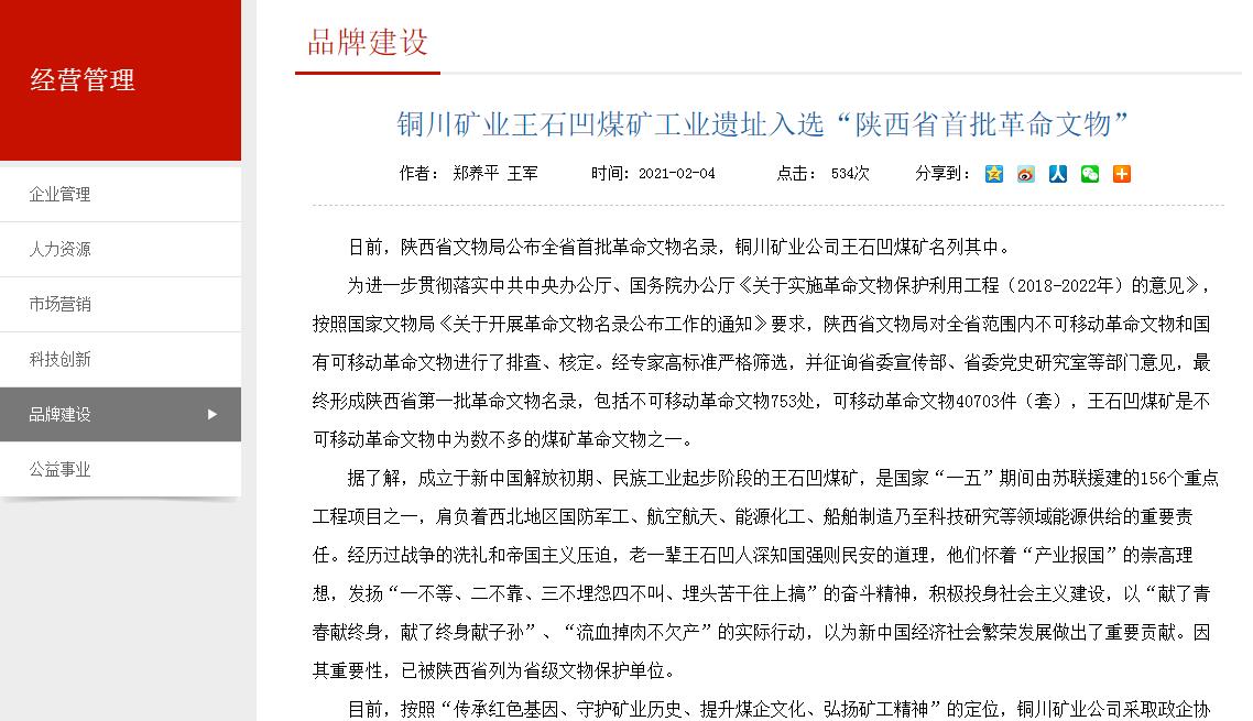 日前,陜西省文物局公布全省首批革命文物名錄,銅川礦業(yè)公司王石凹煤礦名列其中。
