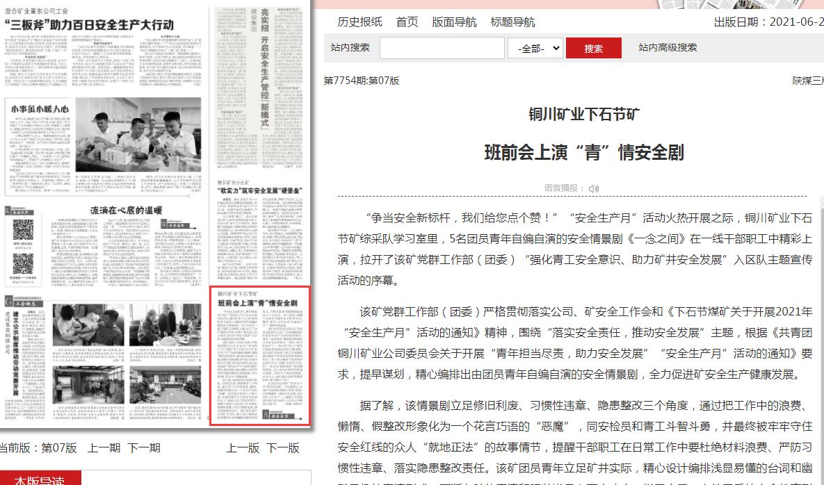 “爭當(dāng)安全新標(biāo)桿,我們給您點個贊!”“安全生產(chǎn)月”活動火熱開展之際,銅川礦業(yè)下石節(jié)礦綜采隊學(xué)習(xí)室里,5名團(tuán)員青年自編自演的安全情景劇《一念之間》在一線干部職工中精彩上演,拉開了該礦黨群工作部(團(tuán)委)“強(qiáng)化青工安全意識、助力礦井安全發(fā)展”入?yún)^(qū)隊主題宣傳活動的序幕。