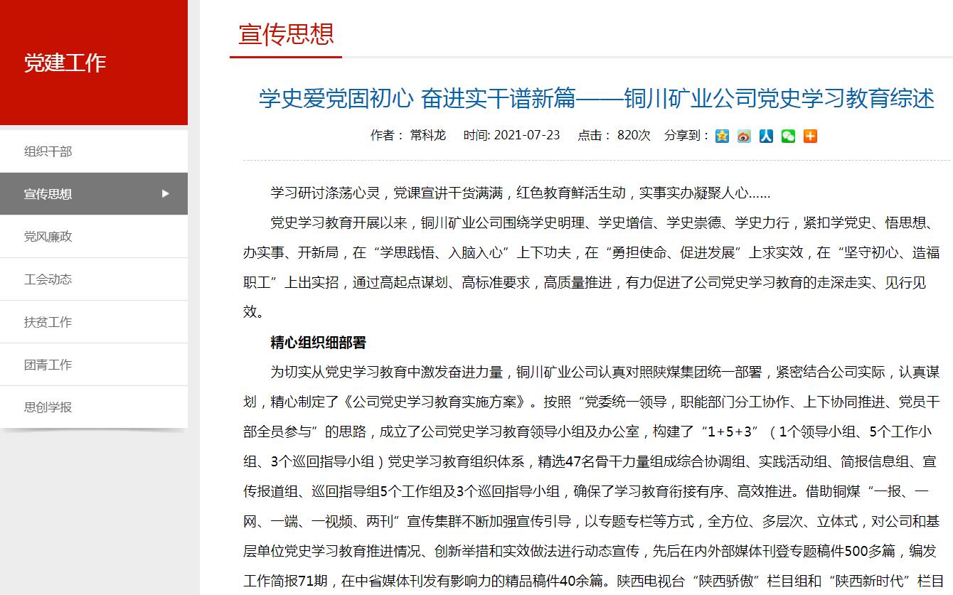 黨史學(xué)習(xí)教育開展以來(lái),銅川礦業(yè)公司圍繞學(xué)史明理、學(xué)史增信、學(xué)史崇德、學(xué)史力行,緊扣學(xué)黨史、悟思想、辦實(shí)事、開新局,在“學(xué)思踐悟、入腦入心”上下功夫,在“勇?lián)姑?、促進(jìn)發(fā)展”上求實(shí)效,在“堅(jiān)守初心、造福職工”上出實(shí)招,通過(guò)高起點(diǎn)謀劃、高標(biāo)準(zhǔn)要求,高質(zhì)量推進(jìn),有力促進(jìn)了公司黨史學(xué)習(xí)教育的走深走實(shí)、見行見效。