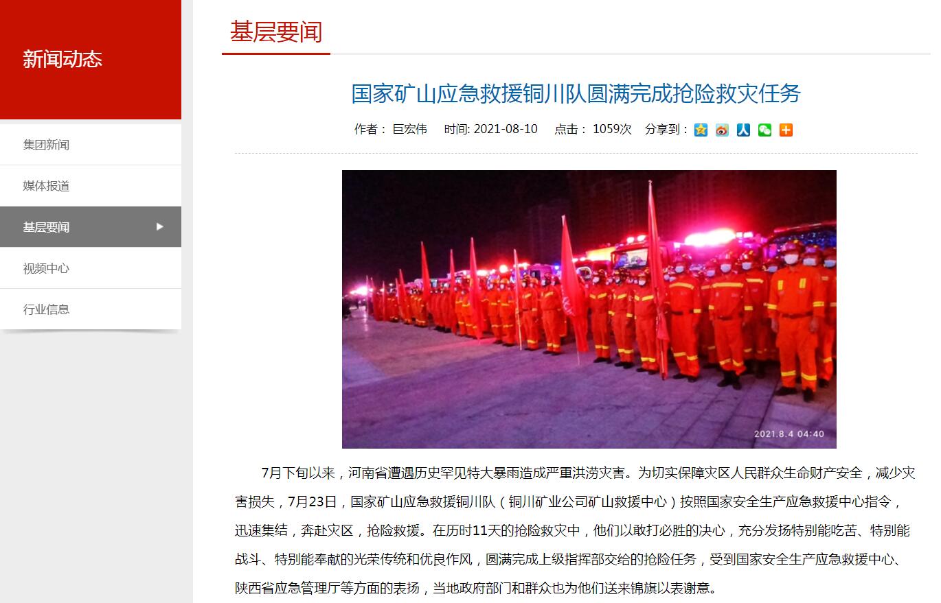 7月下旬以來,河南省遭遇歷史罕見特大暴雨造成嚴重洪澇災(zāi)害。為切實保障災(zāi)區(qū)人民群眾生命財產(chǎn)安全,減少災(zāi)害損失,7月23日,國家礦山應(yīng)急救援銅川隊(銅川礦業(yè)公司礦山救援中心)按照國家安全生產(chǎn)應(yīng)急救援中心指令,迅速集結(jié),奔赴災(zāi)區(qū),搶險救援。在歷時11天的搶險救災(zāi)中,他們以敢打必勝的決心,充分發(fā)揚特別能吃苦、特別能戰(zhàn)斗、特別能奉獻的光榮傳統(tǒng)和優(yōu)良作風(fēng),圓滿完成上級指揮部交給的搶險任務(wù),受到國家安全生產(chǎn)應(yīng)急救援中心、陜西省應(yīng)急管理廳等方面的表揚,當(dāng)?shù)卣块T和群眾也為他們送來錦旗以表謝意。