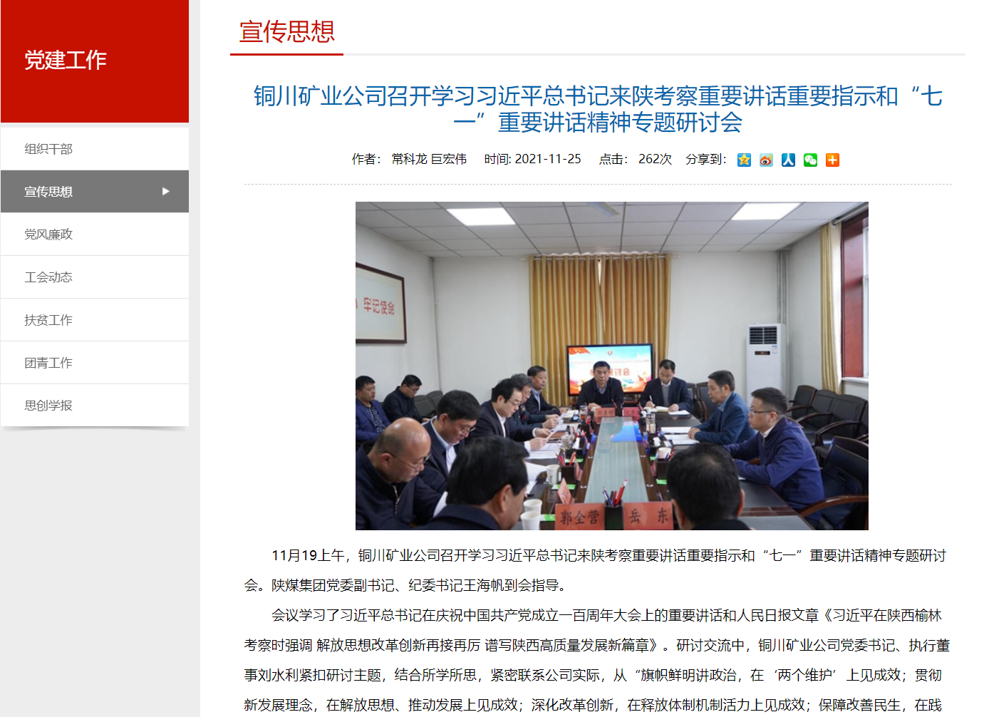 11月19上午,銅川礦業(yè)公司召開學習習近平總書記來陜考察重要講話重要指示和“七一”重要講話精神專題研討會。陜煤集團黨委副書記、紀委書記王海帆到會指導。