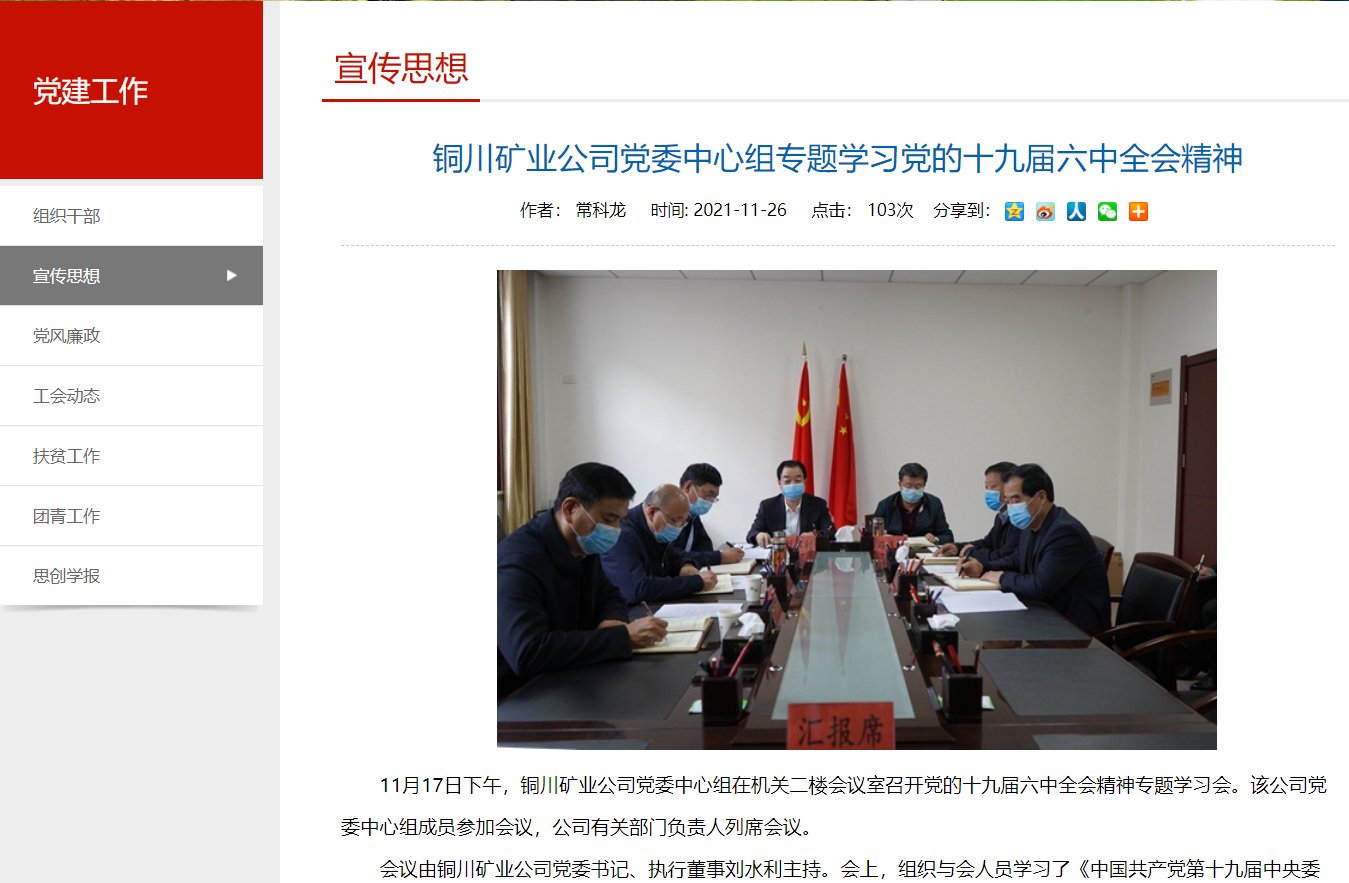 11月17日下午,銅川礦業(yè)公司黨委中心組在機(jī)關(guān)二樓會議室召開黨的十九屆六中全會精神專題學(xué)習(xí)會。該公司黨委中心組成員參加會議,公司有關(guān)部門負(fù)責(zé)人列席會議。