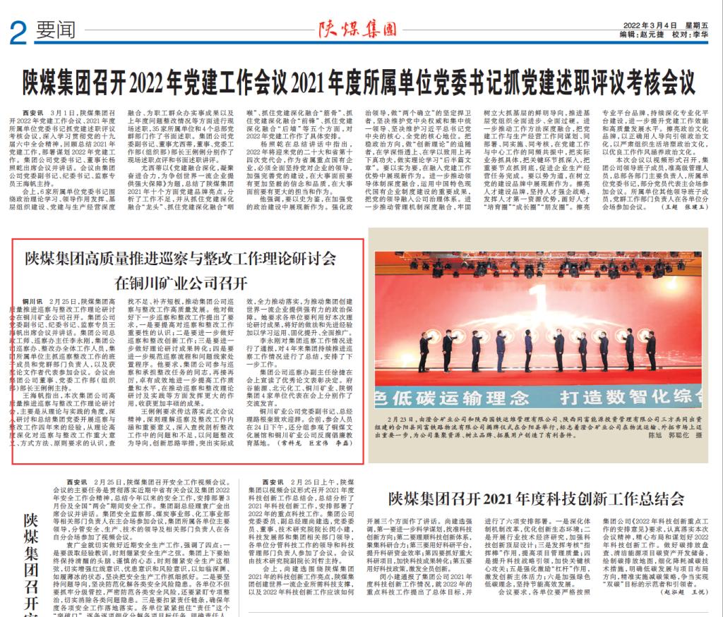 2月25日,陜煤集團(tuán)高質(zhì)量推進(jìn)巡察與整改工作理論研討會在銅川礦業(yè)公司召開。會議圍繞“履行巡察政治職能,堅(jiān)持政治巡察定位,推動巡察和整改工作高質(zhì)量發(fā)展”主題,深入開展研討交流,通過深化認(rèn)識、總結(jié)經(jīng)驗(yàn),進(jìn)一步推動全面從嚴(yán)治黨不斷向縱深發(fā)展、向基層延伸,為順利實(shí)現(xiàn)集團(tuán)公司“十四五”各項(xiàng)目標(biāo)任務(wù)發(fā)揮監(jiān)督保障作用。