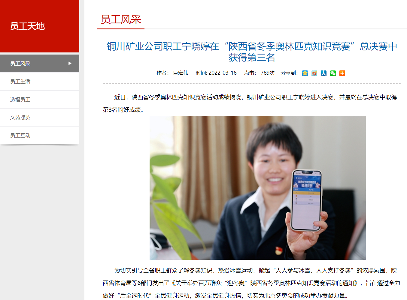 近日,陜西省冬季奧林匹克知識競賽活動成績揭曉,銅川礦業(yè)公司職工寧曉婷進入決賽,并最終在總決賽中取得第3名的好成績。