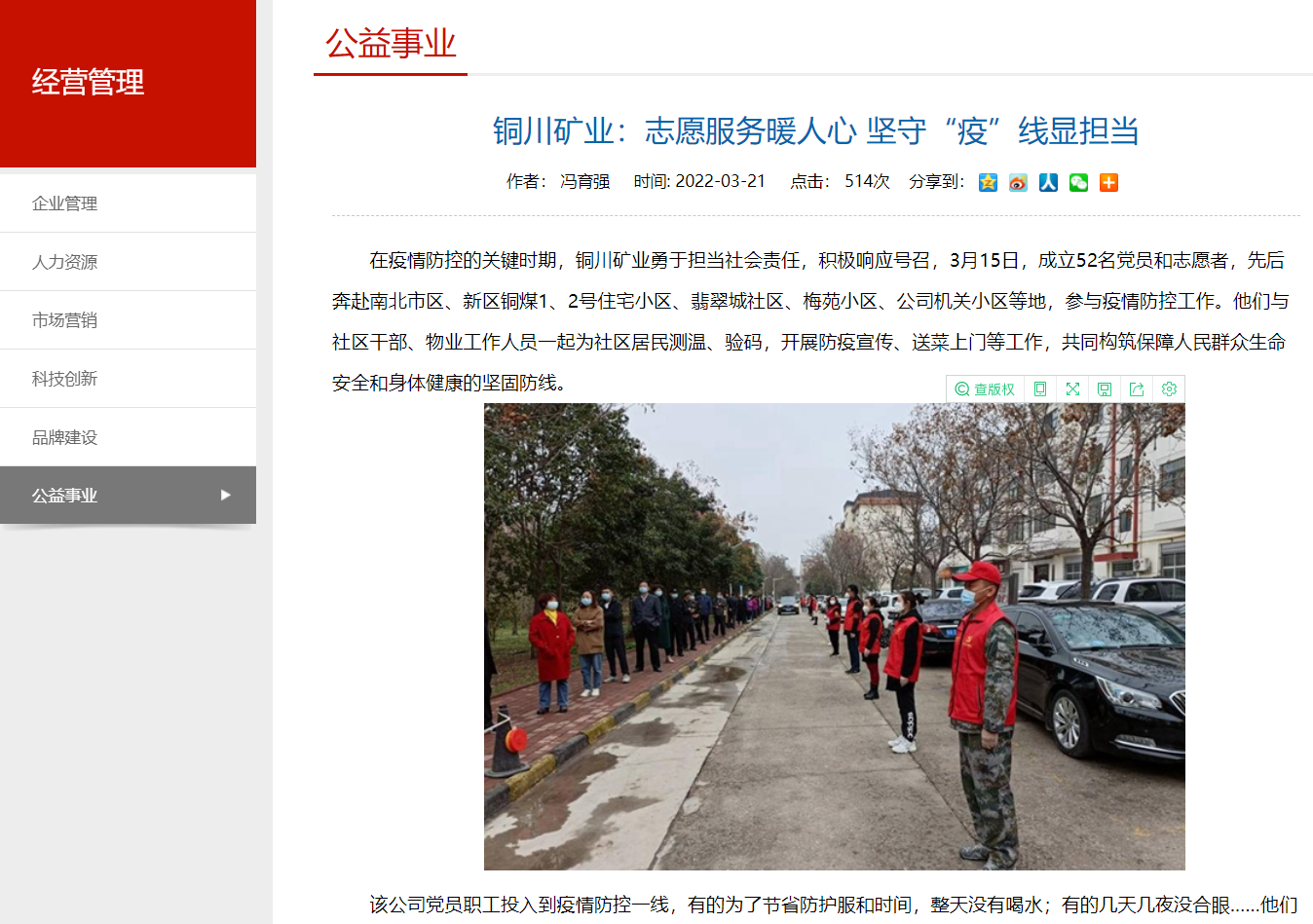 在疫情防控的關(guān)鍵時期,銅川礦業(yè)勇于擔當社會責任,積極響應(yīng)號召,3月15日,成立52名黨員和志愿者,先后奔赴南北市區(qū)、新區(qū)銅煤1、2號住宅小區(qū)、翡翠城社區(qū)、梅苑小區(qū)、公司機關(guān)小區(qū)等地,參與疫情防控工作。他們與社區(qū)干部、物業(yè)工作人員一起為社區(qū)居民測溫、驗碼,開展防疫宣傳、送菜上門等工作,共同構(gòu)筑保障人民群眾生命安全和身體健康的堅固防線。
