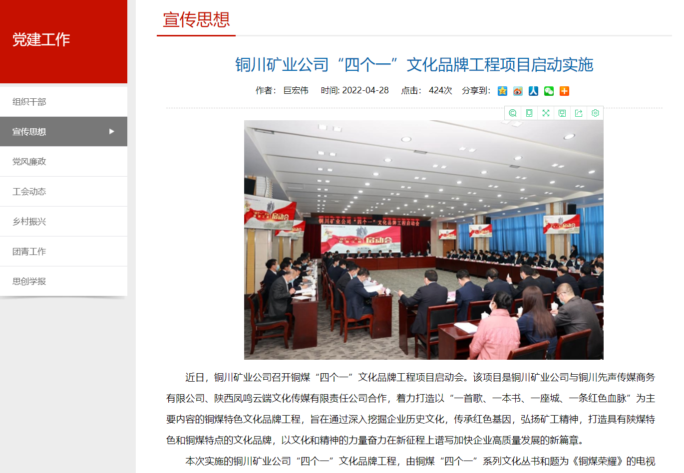 近日,銅川礦業(yè)公司召開銅煤“四個一”文化品牌工程項目啟動會。該項目是銅川礦業(yè)公司與銅川先聲傳媒商務(wù)有限公司、陜西鳳鳴云端文化傳媒有限責(zé)任公司合作,著力打造以“一首歌、一本書、一座城、一條紅色血脈”為主要內(nèi)容的銅煤特色文化品牌工程,旨在通過深入挖掘企業(yè)歷史文化,傳承紅色基因,弘揚(yáng)礦工精神,打造具有陜煤特色和銅煤特點(diǎn)的文化品牌,以文化和精神的力量奮力在新征程上譜寫加快企業(yè)高質(zhì)量發(fā)展的新篇章。