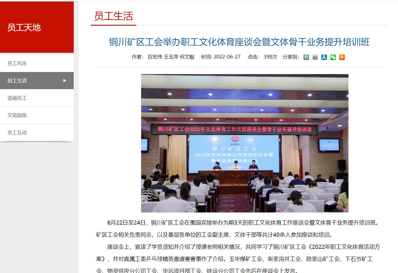 6月22日至24日,銅川礦區(qū)工會在寓園賓館舉辦為期3天的職工文化體育工作座談會暨文體骨干業(yè)務(wù)提升培訓(xùn)班。礦區(qū)工會相關(guān)負(fù)責(zé)同志,以及基層各單位的工會副主席、文體干部等共計40余人參加座談和培訓(xùn)。