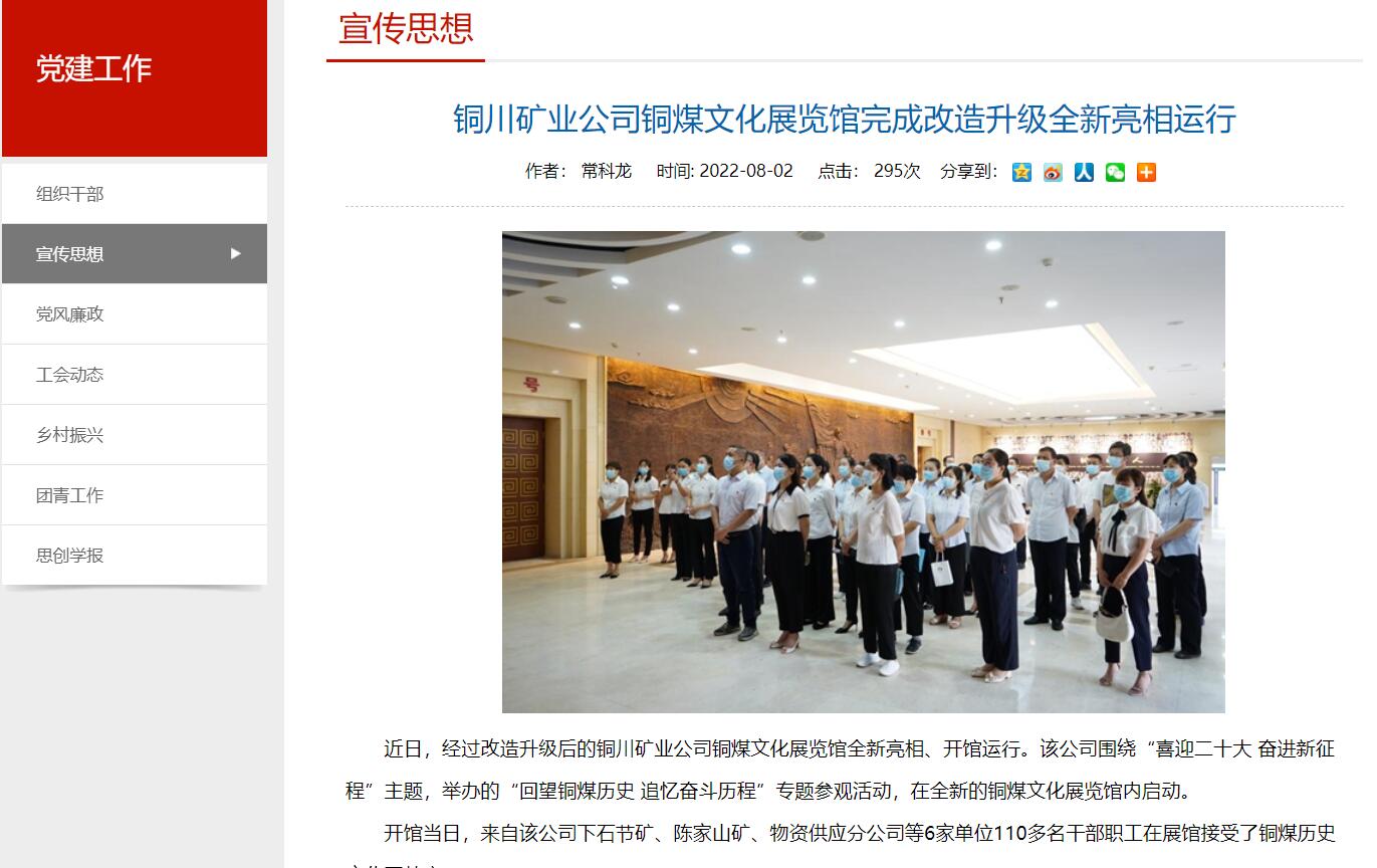 近日,經(jīng)過(guò)改造升級(jí)后的銅川礦業(yè)公司銅煤文化展覽館全新亮相、開(kāi)館運(yùn)行。該公司圍繞“喜迎二十大 奮進(jìn)新征程”主題,舉辦的“回望銅煤歷史 追憶奮斗歷程”專題參觀活動(dòng),在全新的銅煤文化展覽館內(nèi)啟動(dòng)。