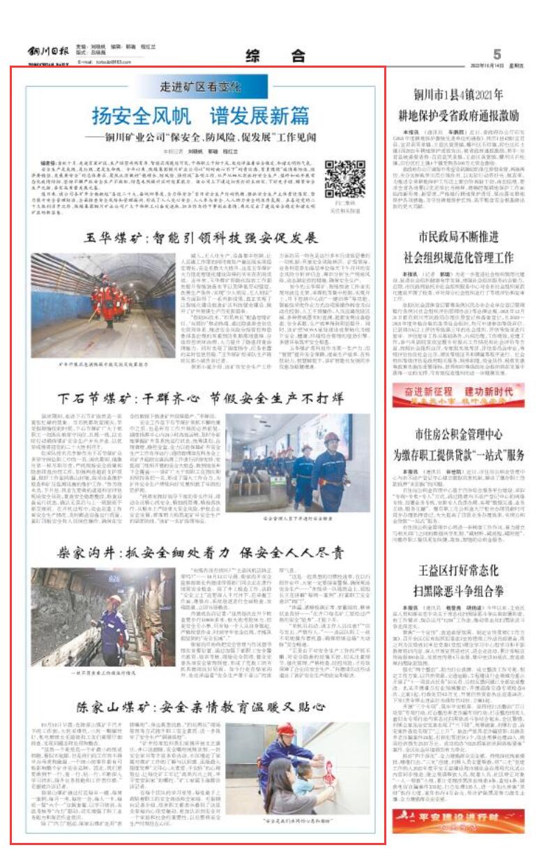 連日來,該公司各礦井全面掀起“喜迎二十大、奮戰(zhàn)四季度、全力保安全”百日安全生產行動熱潮,狠抓安全生產主體責任落實,努力提升安全管理標準,全面排查安全風險和管理漏洞,形成了人人關心安全、人人參與安全、人人助力安全的濃厚氛圍。在喜迎黨的二十大勝利召開之際,陜煤集團銅川礦業(yè)公司廣大干部職工以奮發(fā)進取、擔當作為的干事創(chuàng)業(yè)豪情,再次交出了建設安全穩(wěn)定和諧文明礦區(qū)的新答卷。