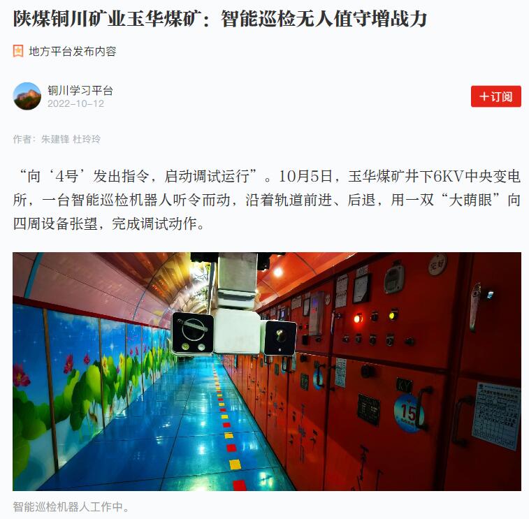 “向‘4號(hào)’發(fā)出指令,啟動(dòng)調(diào)試運(yùn)行”。10月5日,玉華煤礦井下6KV中央變電所,一臺(tái)智能巡檢機(jī)器人聽令而動(dòng),沿著軌道前進(jìn)、后退,用一雙“大萌眼”向四周設(shè)備張望,完成調(diào)試動(dòng)作。