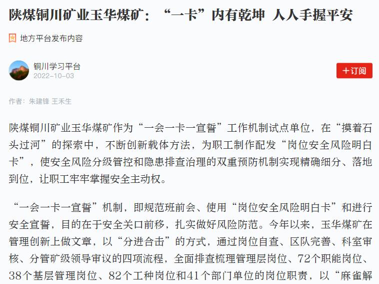 陜煤銅川礦業(yè)玉華煤礦作為“一會一卡一宣誓”工作機制試點單位,在“摸著石頭過河”的探索中,不斷創(chuàng)新載體方法,為職工制作配發(fā)“崗位安全風(fēng)險明白卡”,使安全風(fēng)險分級管控和隱患排查治理的雙重預(yù)防機制實現(xiàn)精確細分、落地到位,讓職工牢牢掌握安全主動權(quán)。