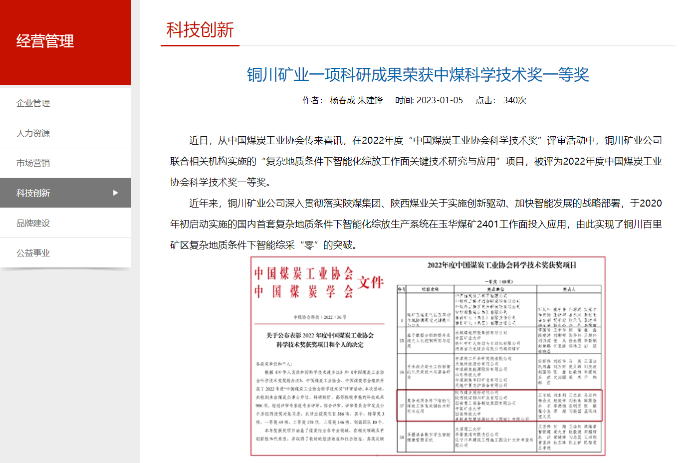 近日,從中國(guó)煤炭工業(yè)協(xié)會(huì)傳來喜訊,在2022年度“中國(guó)煤炭工業(yè)協(xié)會(huì)科學(xué)技術(shù)獎(jiǎng)”評(píng)審活動(dòng)中,銅川礦業(yè)公司聯(lián)合相關(guān)機(jī)構(gòu)實(shí)施的“復(fù)雜地質(zhì)條件下智能化綜放工作面關(guān)鍵技術(shù)研究與應(yīng)用”項(xiàng)目,被評(píng)為2022年度中國(guó)煤炭工業(yè)協(xié)會(huì)科學(xué)技術(shù)獎(jiǎng)一等獎(jiǎng)。