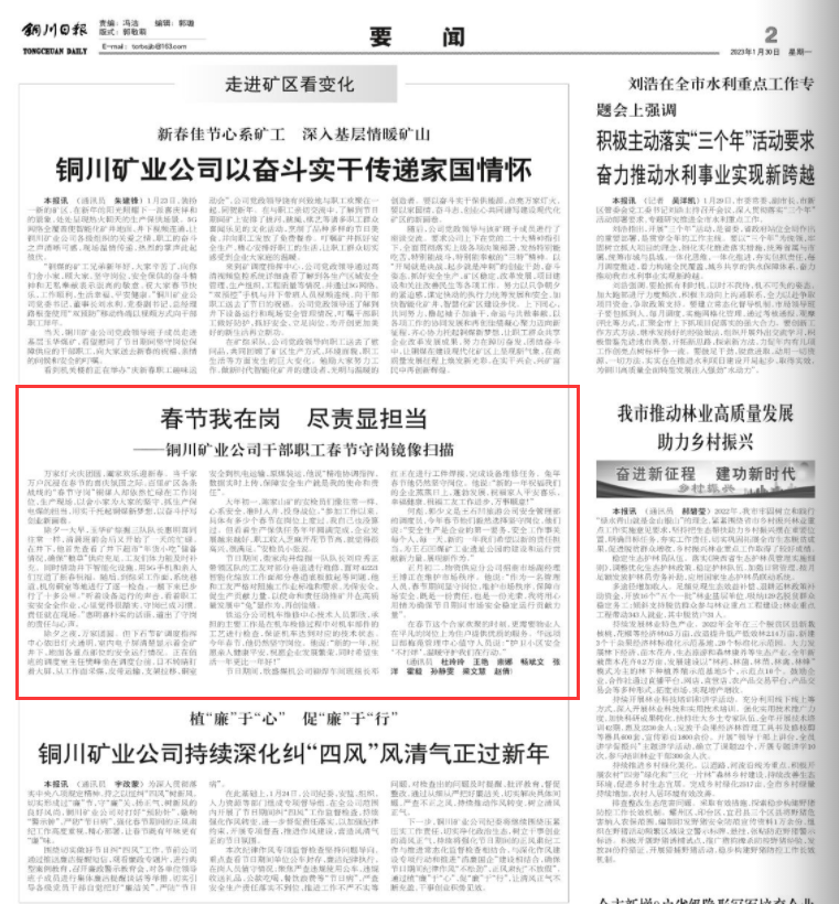 萬(wàn)家燈火慶團(tuán)圓,闔家歡樂(lè)迎新春。當(dāng)千家萬(wàn)戶沉浸在春節(jié)的喜慶氛圍之際,百里礦區(qū)各條戰(zhàn)線的“春節(jié)守崗”銅煤人卻依然忙碌在工作崗位、生產(chǎn)現(xiàn)場(chǎng),以舍小家為大家的堅(jiān)守,抓生產(chǎn)保電煤的擔(dān)當(dāng),用實(shí)干托起銅煤新夢(mèng)想,以?shī)^斗抒寫創(chuàng)業(yè)新畫卷。