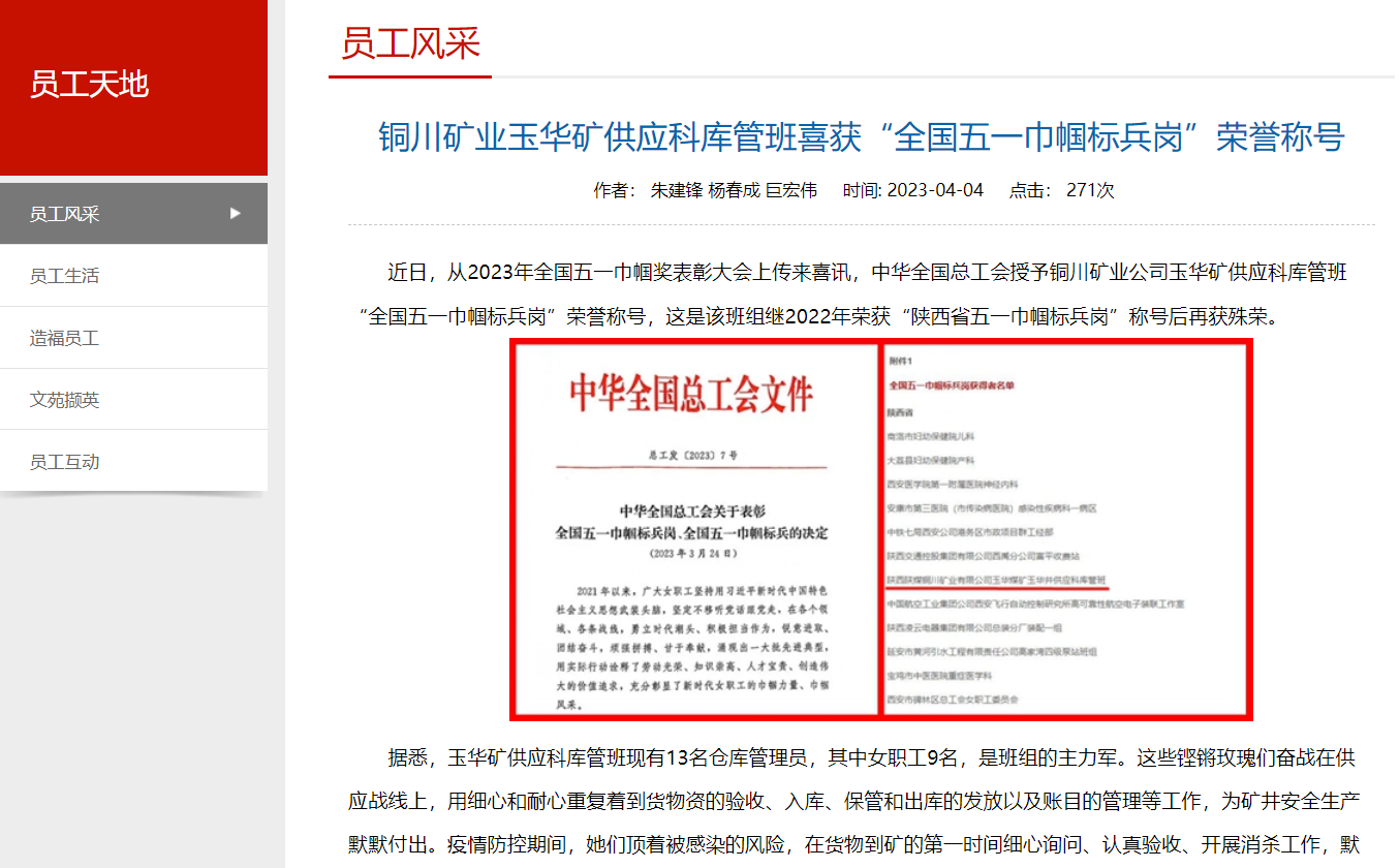近日,從2023年全國五一巾幗獎表彰大會上傳來喜訊,中華全國總工會授予銅川礦業(yè)公司玉華礦供應(yīng)科庫管班“全國五一巾幗標兵崗”榮譽稱號,這是該班組繼2022年榮獲“陜西省五一巾幗標兵崗”稱號后再獲殊榮。