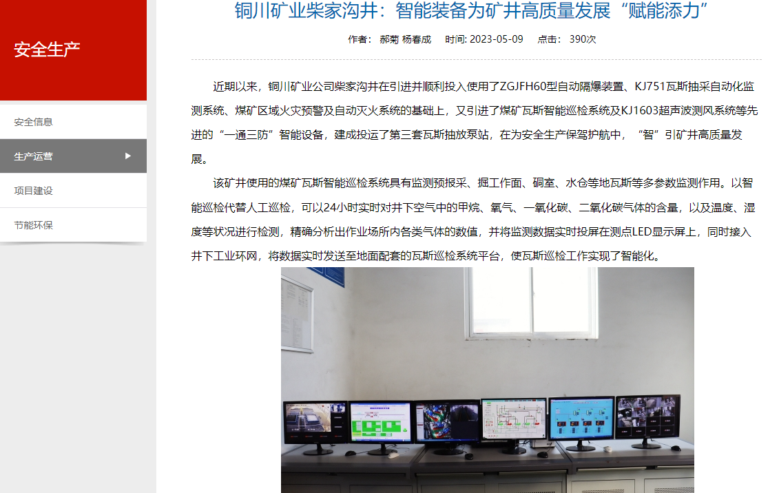 近期以來,銅川礦業(yè)公司柴家溝井在引進(jìn)并順利投入使用了ZGJFH60型自動(dòng)隔爆裝置、KJ751瓦斯抽采自動(dòng)化監(jiān)測(cè)系統(tǒng)、煤礦區(qū)域火災(zāi)預(yù)警及自動(dòng)滅火系統(tǒng)的基礎(chǔ)上,又引進(jìn)了煤礦瓦斯智能巡檢系統(tǒng)及KJ1603超聲波測(cè)風(fēng)系統(tǒng)等先進(jìn)的“一通三防”智能設(shè)備,建成投運(yùn)了第三套瓦斯抽放泵站,在為安全生產(chǎn)保駕護(hù)航中,“智”引礦井高質(zhì)量發(fā)展。