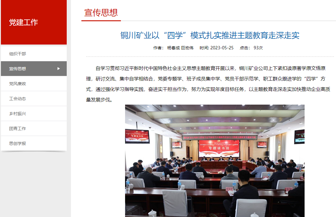 自學(xué)習(xí)貫徹習(xí)近平新時代中國特色社會主義思想主題教育開展以來,銅川礦業(yè)公司上下緊扣讀原著學(xué)原文悟原理,研討交流、集中自學(xué)相結(jié)合,黨委專題學(xué)、班子成員集中學(xué)、黨員干部示范學(xué)、職工群眾跟進學(xué)的“四學(xué)”方式,通過強化學(xué)習(xí)指導(dǎo)實踐,奮進實干擔(dān)當(dāng)作為,努力為實現(xiàn)年度目標(biāo)任務(wù),以主題教育走深走實加快推動企業(yè)高質(zhì)量發(fā)展步伐。