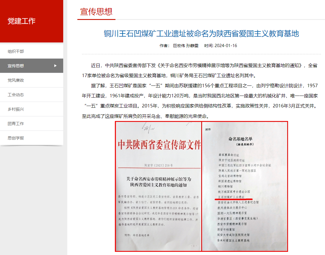 銅川王石凹煤礦工業(yè)遺址被命名為陜西省愛(ài)國(guó)主義教育基地