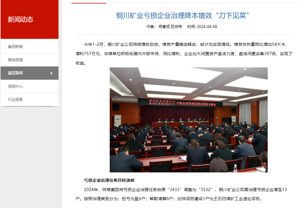 2024年,陜煤集團將虧損企業(yè)治理任務由原“3433”調整為“3532”,銅川礦業(yè)公司需治理虧損企業(yè)增至13戶。按照治理類型分為:扭虧為盈6戶;解散清算6戶;加快項目建設1戶為王石凹煤礦工業(yè)遺址項目。