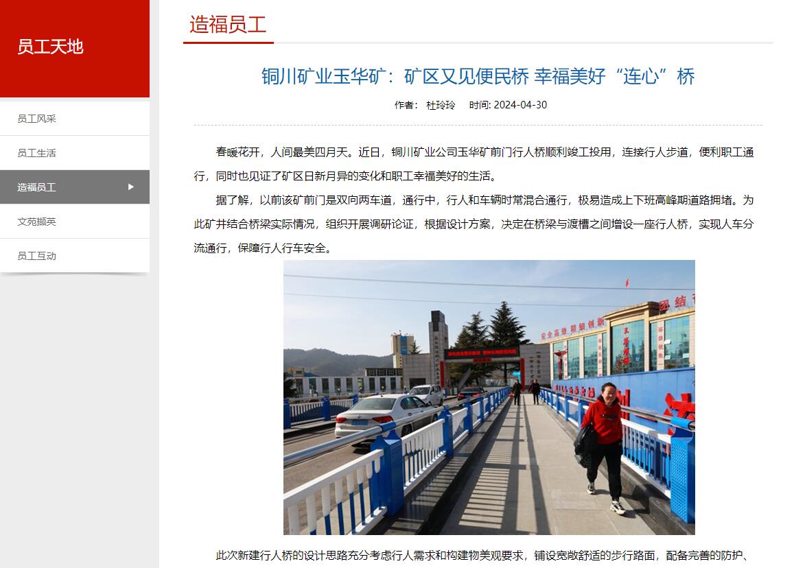 春暖花開,人間最美四月天。近日,銅川礦業(yè)公司玉華礦前門行人橋順利竣工投用,連接行人步道,便利職工通行,同時也見證了礦區(qū)日新月異的變化和職工幸福美好的生活。
