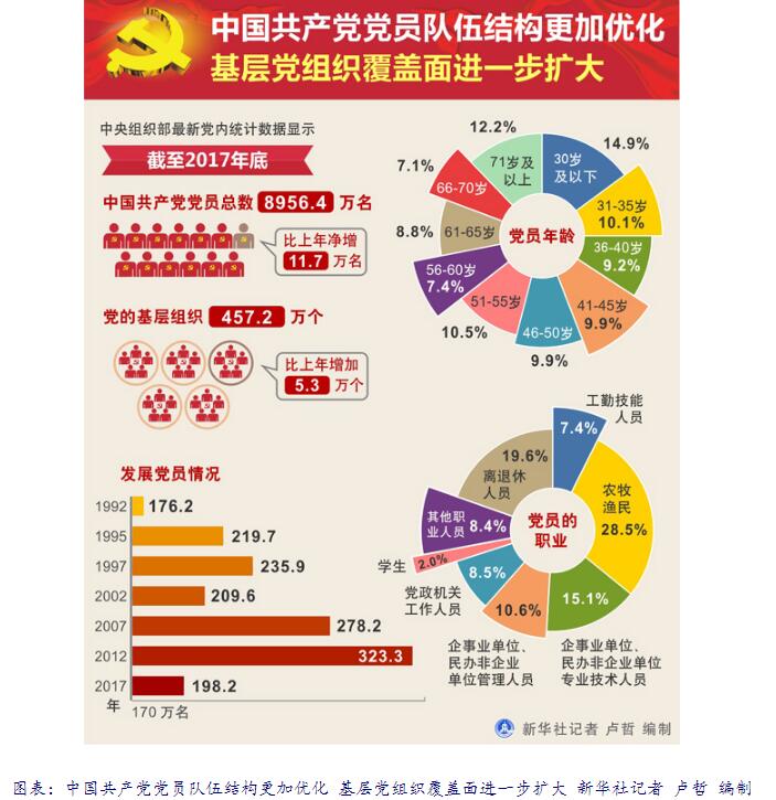 截至2017年12月31日,中國(guó)共產(chǎn)黨黨員總數(shù)為8956.4萬名,比上年凈增11.7萬名,增幅為0.1%。