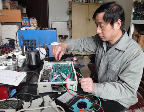 圖為馬中信同志在義務(wù)為職工家屬維修家用電器現(xiàn)場(chǎng)