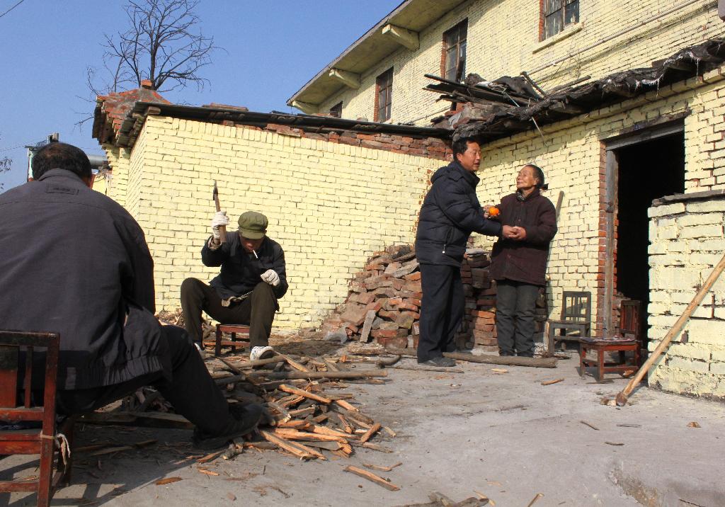 只見王石凹礦家屬區(qū)下東山糧站附近一居戶院門口,有兩人正熱火朝天地忙著劈柴,另外一人一邊勸戶主老太太將手中的桔子留著自己吃,一邊拉著老太太往凳子上坐。