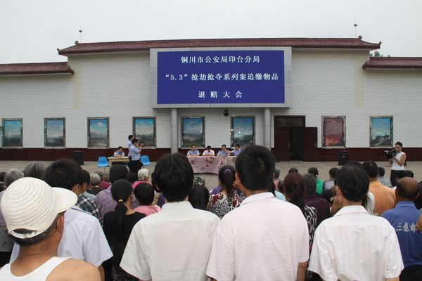 6月22日上午,銅川市公安局印臺(tái)分局,在鴨口公司文化廣場(chǎng)召開(kāi)了“5.3”搶劫搶奪系列案件追繳物品退賠大會(huì)。為鴨口礦區(qū)10位被搶奪了金銀首飾的受害老人追回退賠現(xiàn)金15000余元。為感謝印臺(tái)分局在接到報(bào)案后迅速出警,將犯罪團(tuán)伙抓捕歸案,并在鴨口礦區(qū)召開(kāi)公捕大會(huì),教育了社區(qū)廣大群眾,伸張了正義、維護(hù)了礦區(qū)穩(wěn)定,鴨口社區(qū)居民向其送去感謝信并贈(zèng)送“不負(fù)警察使命、確保一方平安”的錦旗。