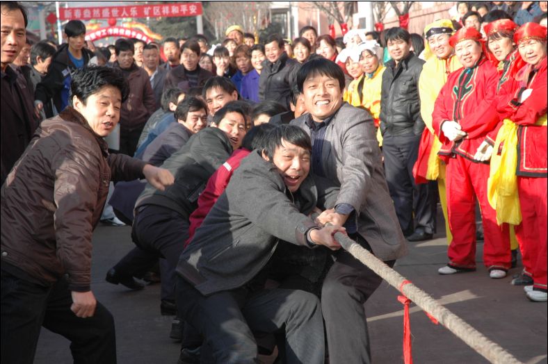為活躍節(jié)日氣氛,讓員工過上一個(gè)歡快祥和的元宵佳節(jié),公司工會(huì)組織各生產(chǎn)單位舉行了大型的拔河比賽。上午9點(diǎn),礦部?jī)?nèi)爆竹聲聲,鑼鼓喧天,彩旗招展,鑼鼓隊(duì)、舞龍隊(duì)、秧歌隊(duì)沿礦區(qū)一邊行進(jìn)一邊表演,吸引了路人的目光。單身樓前聚集了參加比賽的員工和前來加油助威的家屬,把整個(gè)單身樓前圍得是水泄不通,熱鬧非凡。比賽采用三局兩勝制,共12支參賽隊(duì)伍,8支男隊(duì),4支女隊(duì),男隊(duì)經(jīng)半決賽淘汰,由決賽遴選出冠軍,而女隊(duì)采用單循環(huán)。首先出場(chǎng)的是基建隊(duì)和掘一隊(duì),剛一出場(chǎng)就給大家?guī)聿恍〉捏@訝,因?yàn)榛?duì)是男女混搭的。在裁判員一聲哨音下,兩支隊(duì)伍喊著號(hào)子,開始了激烈的比賽,也許真是應(yīng)了“男女搭配干活不累”,第一局基建隊(duì)竟然贏了。但接下來,掘一隊(duì)不甘失敗,連扳兩局,最終以2:1贏得比賽。在比賽過程中,氣氛最熱烈的還屬醫(yī)院和物管科,兩方女將勢(shì)均力敵,不斷僵持,從場(chǎng)地中央拉到場(chǎng)地邊緣,仍不分上下,員工家屬在旁不斷呼喊,在物管科的女將不懈堅(jiān)持下,最終以2:0戰(zhàn)勝醫(yī)院。而在采一和采三比賽中,更讓人感動(dòng)的是,在拔河比賽進(jìn)行中,一名員工的鞋子被踩掉,但他光著腳仍完成了整個(gè)比賽。經(jīng)過半決賽,角逐出機(jī)關(guān)、運(yùn)輸區(qū)、采一3支隊(duì)伍進(jìn)入決賽;在決賽中,由于機(jī)關(guān)不敵運(yùn)輸區(qū)而位居第三,運(yùn)輸區(qū)乘勝追擊拿下采一,贏得冠軍,而采一屈居第二。遠(yuǎn)處鑼鼓隊(duì)、舞龍隊(duì)、秧歌隊(duì)緩緩走來,讓比賽在一片歡歌笑語、鑼鼓喧天的氣氛中拉下帷幕。