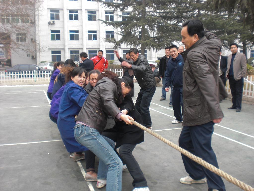 隨著哨音的吹響,激動人心的拔河比賽開始了!各個代表隊輪番上場,雙方隊員緊緊抓牢手中的繩子,個個使出渾身力氣,咬緊牙關,臉憋得通紅,雙手拔得通紅,仍然奮力拼搏,齊心協(xié)力往后拉。場場比賽牽動著場外觀賽職工的心,紛紛在旁加油助威,熱情的啦啦隊在場外高喊著“加油!加油!”,笑聲、掌聲、加油聲此起彼伏。。。。。。