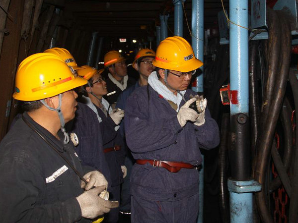 4月9日,在該公司安監(jiān)處長查義堂,黨委工作部、安質(zhì)科、工會(huì)等相關(guān)科室人員的陪同下三位青年編輯戴上安全帽,背上自救器和礦燈,深入井下生產(chǎn)一線,深入工作面,對井下生產(chǎn)過程進(jìn)行了全面了解。升井后,三位青年編輯有關(guān)領(lǐng)導(dǎo)的陪同下,先后對該公司安全文化長廊、醫(yī)院、員工工食堂等地進(jìn)行了參觀采訪,并對該公司發(fā)明出“十米連鎖”的生產(chǎn)科科長席聯(lián)校和有56年黨齡的老黨員高秀英進(jìn)行了采訪,拉開了“青年編輯下基層”主題教育實(shí)踐活動(dòng)的帷幕。