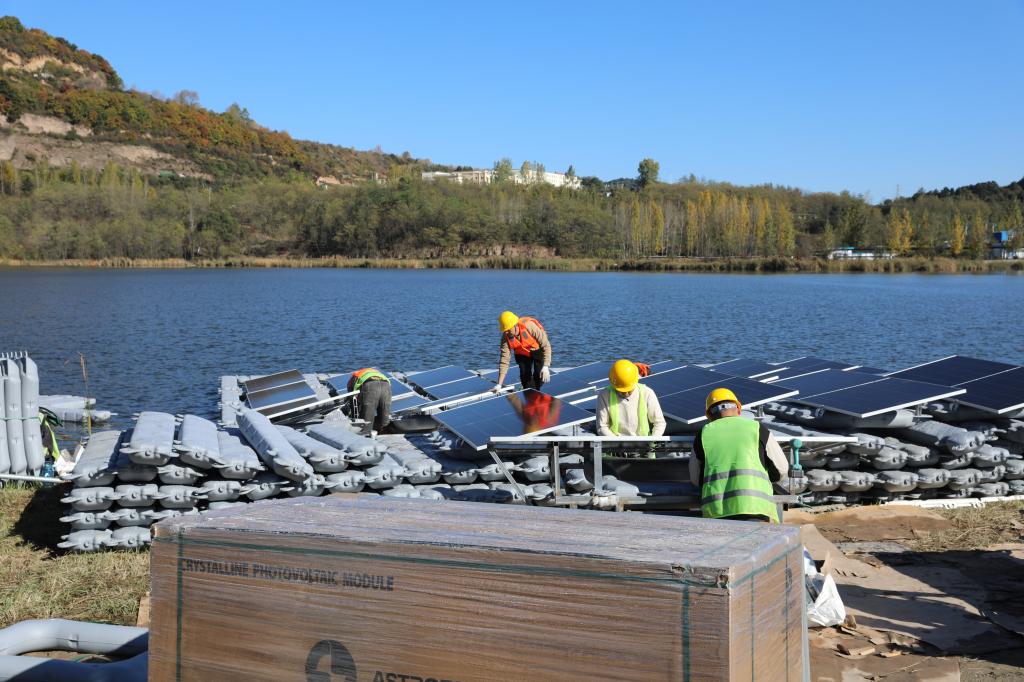 近日,由欣榮公司負(fù)責(zé)項(xiàng)目建設(shè)的公司90MWp分布式光伏項(xiàng)目(一期)正在北區(qū)、東區(qū)各片區(qū)緊張的施工中。在玉華玉北湖面光伏項(xiàng)目建設(shè)現(xiàn)場(chǎng),工人們正在緊張有序地安裝光伏板。已經(jīng)建設(shè)好的一排排光伏板連線成片,宛如藍(lán)色的海洋,向湖面深處不斷延伸,呈現(xiàn)出一派蓬勃發(fā)展的新氣象。