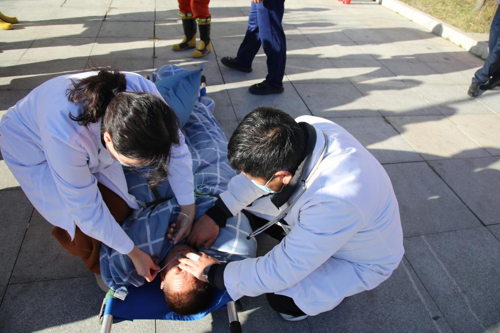 演練過程中,駐礦救護隊員們?nèi)缟癖旖?,迅速展開滅火救援,對準著火點噴射,精準壓制火勢。各樓層職工聞聲而動,在樓層引導員的指揮下,低姿彎腰、手捂口鼻、沿著墻壁快步前行,有序向樓下疏散。陳家山醫(yī)院救護人員第一時間對受傷員工進行急救,整個過程一氣呵成、緊張有序,盡顯專業(yè)素養(yǎng)與高效協(xié)同。