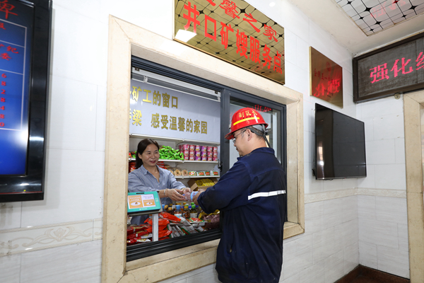 該礦井口礦嫂服務(wù)點,女工家屬熱情的為來往的職工提供便攜食品和飲品,叮囑大家要按章指揮,按章作業(yè),牢記安全?!拔业淖饕录绨蛱庨_線了,麻煩幫我補一下吧!”礦嫂在縫紉機(jī)前三兩下便將開線部位縫補完成,讓職工感到貼心更暖心。