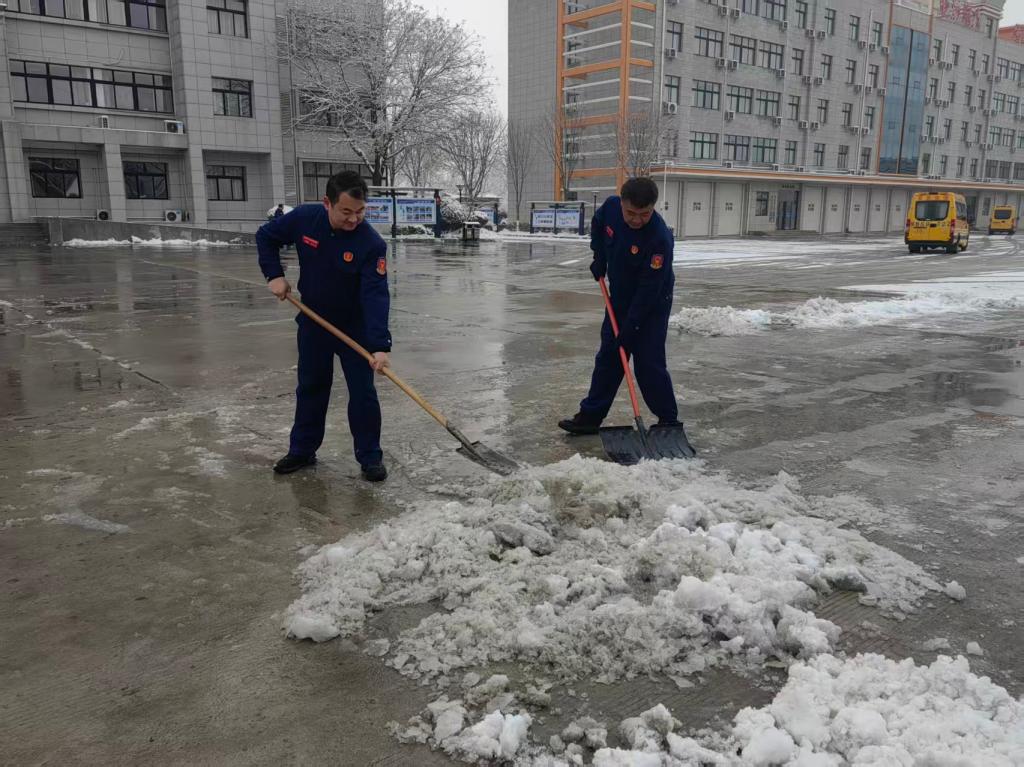 大隊(duì)第一時(shí)間組織各中隊(duì)及科室攜帶鐵鍬、掃帚、推雪板等清掃工具,奔赴各責(zé)任區(qū)域,清掃主干道、車庫門前、訓(xùn)練場地及主要出入口的積雪暗冰,確保各環(huán)節(jié)安全無虞。