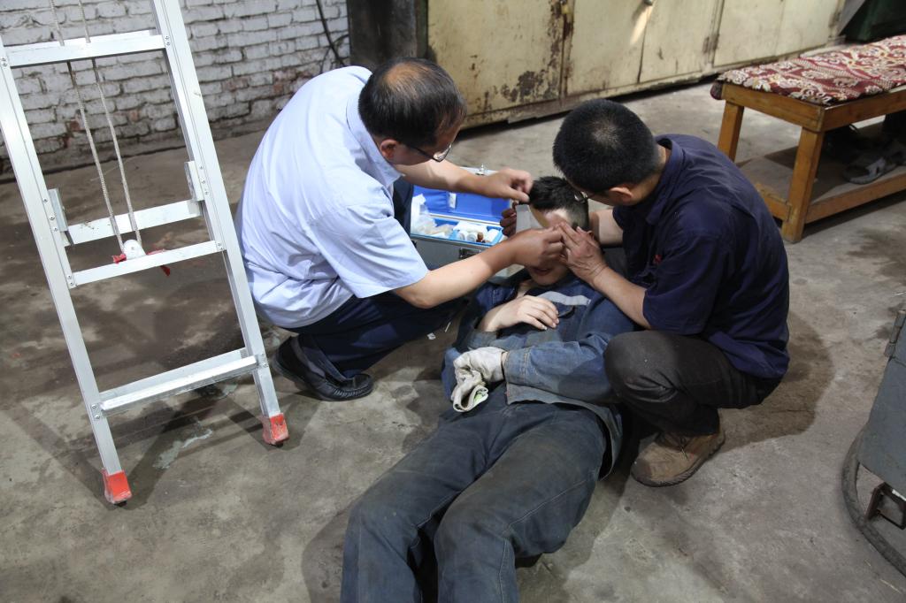 高空作業(yè)事故演練,模擬一名職工在高空作業(yè)時(shí),不慎跌落,在旁邊工作的同事看到后緊急施救的場景。參與救助的職工迅速撥打120急救電話,詳細(xì)報(bào)告事故種類、地點(diǎn)和目前患者情況,請求立即派救護(hù)車,并當(dāng)即向分管領(lǐng)導(dǎo)報(bào)告事故狀況并請求派人幫助。其他參與救援的職工迅速劃定警戒線,對受傷者大聲的呼叫,判斷其意識(shí)情況,在檢查心跳、呼吸、瞳孔情況后,擺正受傷者姿勢,并做好頸椎和腰椎的固定保護(hù)。解開患者的上衣,進(jìn)行體外心臟除顫,查看無呼吸與心跳后,清除口腔內(nèi)的異物,進(jìn)行心肺復(fù)蘇,經(jīng)過反復(fù)施救,直至患者恢復(fù)呼吸和心跳,等待120急救車的到來......