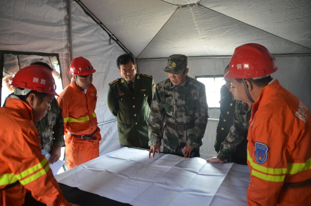 上午10時42分,第一批指戰(zhàn)員全部到達事故現場。帶隊指揮員向施工方詳細了解災情,并成立現場指揮部,馬上派出偵查小隊前往事故地點進行認真?zhèn)刹?,進一步了解災區(qū)情況。由于災情復雜、電力受損嚴重、現場條件極為簡陋,救援所需時間較長。為在第一時間救出被困人員,最大限度降低事故損失,救援指揮部根據災情和現場指揮部請求,決定派出第二批指戰(zhàn)員,出動救援裝備保障車、發(fā)電照明車、野外生活保障車和工具車攜帶所需裝備前往支援,其他指戰(zhàn)員迅速轉為值備班隊隨時待命。