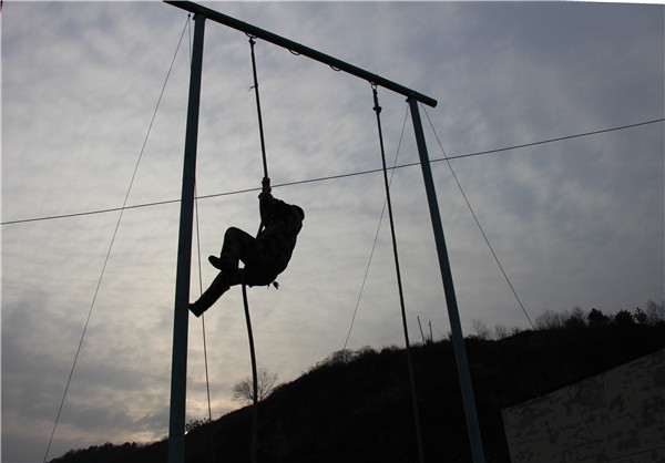 一聲短促有力的集合哨音打破院中寧靜,二小隊(duì)的隊(duì)員們精神抖擻列隊(duì)完畢。8公里跑步拉練熱身后,手握還沾著露水的繩索,一個(gè)個(gè)身手迅捷、揮汗如雨的開始了爬繩、單杠、舉重課目操練。玉華煤礦救護(hù)中隊(duì)隊(duì)員在這寂靜的礦區(qū)清晨開始了日常訓(xùn)練。