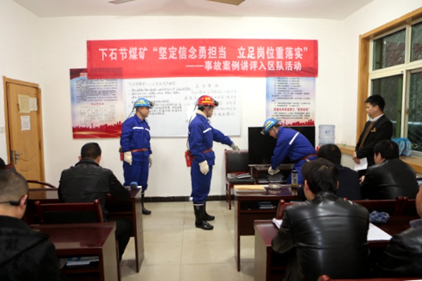 這是在該礦綜采隊(duì)8點(diǎn)班前會(huì)上四名團(tuán)員青年正在開展的事故案例講評(píng)活動(dòng)。通過現(xiàn)身說教,進(jìn)一步增強(qiáng)職工安全意識(shí),提升“自?;ケB?lián)保”能力,警示習(xí)慣性違章的危害,確保自覺踐行安全規(guī)程措施上起到了積極作用。通過還原事故經(jīng)過、講述事故后對(duì)家庭帶來的傷害、入情入理地講評(píng)剖析,使職工在接受教育和深刻反思中,將安全理念時(shí)刻牢記于心,落實(shí)于行。