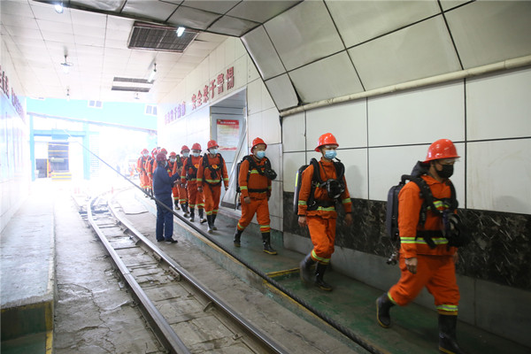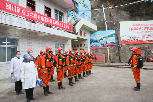 在該礦工業(yè)廣場,救護隊員與醫(yī)護人員各個精神抖擻,整裝待發(fā),在救護隊長的安排下,跑步前行乘坐人車前往井下實施救援工作。