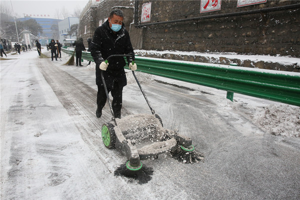 掃雪中,該礦機(jī)關(guān)各部室所有成員在礦黨政的統(tǒng)一安排部署下,分管領(lǐng)導(dǎo)的帶領(lǐng)下,采取分組包段制,他們有的手持掃把、有的手持鐵鍬、有的手推鏟車等掃雪工具,從馬坊村進(jìn)礦聚財(cái)橋處到礦內(nèi)運(yùn)煤專線及辦公樓前環(huán)形路段、工業(yè)廣場(chǎng)和家屬區(qū)等所有道路上的積雪進(jìn)行全面清掃,雖然天空還在飄著雪花,寒風(fēng)刺骨凜冽,但他們個(gè)個(gè)干勁十足,忙碌的身影構(gòu)成了一道靚麗的風(fēng)景線,在近4個(gè)多小時(shí)的清掃,礦內(nèi)道路上的積雪被清理了出來(lái),方便了上下班職工和車輛安全出行。